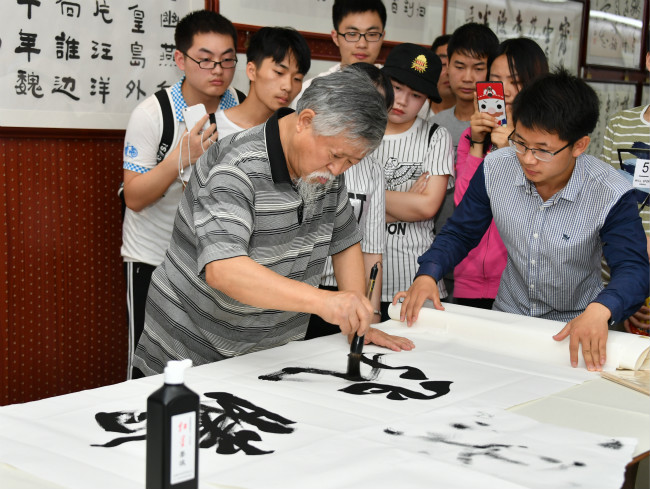 开幕式结束后,书画艺术家们即兴挥毫泼墨,一展艺术才华。艺术家们一边笔走龙蛇,行云流水,佳作迭出,一边现场指导学生会员书画创作。艺术气氛浓郁醇厚,欢快热烈。